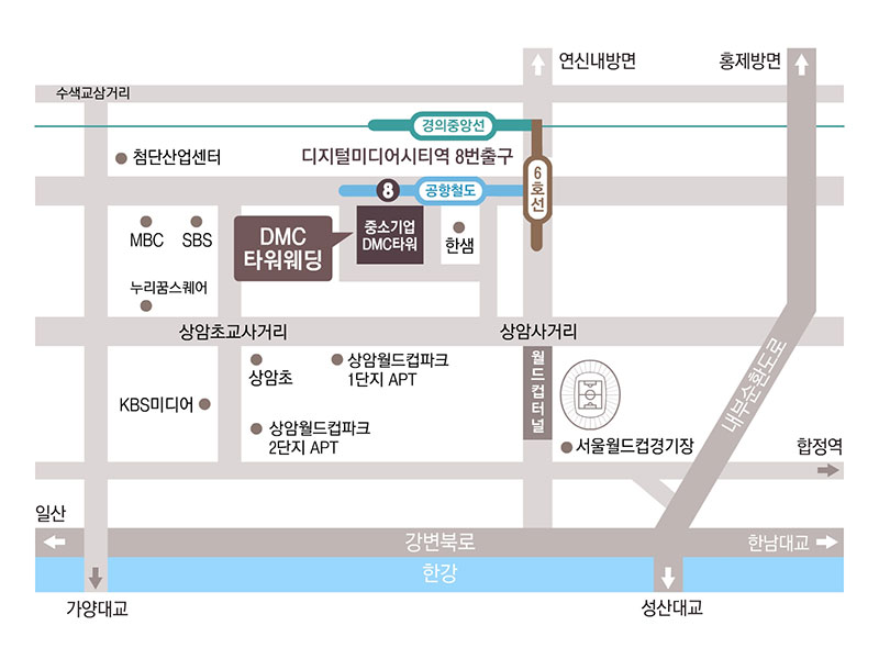 주소 및 연락처 Address 도로명 주소서울특별시 마포구 성암로 189 중소기업DMC타워 2F 지번 주소서울시 마포구 상암동 1622번지 대표전화 1899-1221 팩스번호 02-3151-0350 네이버 빠른길 찾기 → 네이버 지도 크게 보기 → 약도 및 교통 안내 지하철 이용시 디지털미디어시티역 8번출구 → 웨딩홀 연결 6호선 디지털미디어시티역 8번출구 공항철도 디지털미디어시티역 8번출구 경의중앙선 디지털미디어시티역 지하보도를 통한 8번출구 버스 이용시 공항철도디지털미디어시티역 [14359] / DMC타워웨딩 앞 지선버스 6715, 7013A, 7013B, 7737 일반버스 730 마을버스 마포18, 마포18-1 DMC타워웨딩 인근 버스 정류장 간선버스 771 (디지털미디어시티역2번출구 하차)171, 172, 673, 710 (월드컵경기장북측 하차) 지선버스 7016, 7711, 7730 (디지털미디어시티역2번출구 하차) 광역버스 9711A (월드컵경기장북측 하차) 공항버스 6012 (상암동입구 하차) 실시간 버스노선 자가용 이용시 네비게이션 : "DMC타워웨딩" 또는 "디지털미디어시티역 8번출구" 입력 주소 검색 : "성암로 189" 또는 "서울 마포구 상암동 1622" 입력 네이버 빠른길 찾기 약도 인쇄 및 다운로드 약도 인쇄하기 약도 다운로드(PDF) Car 자가용 주요 도로 주행 경로 가양대교 → 가양대로 직진후 → DMC첨단산업센터삼거리 우회전 → 성암사거리방면 약 1km 직진 → 중소기업DMC타워(DMC타워웨딩) 정문 내부순환(연희램프 진출) → 모래내 지하차도 중동초교 우회전 → 상암사거리 직진 후 이면도로 우회전 → 한샘(구.팬택) 건물 앞에서 좌회전 강변북로(마포) → 월드컵경기장(진출) → 직진 → 월드컵터널 나와서 상암사거리 좌회전 → 이면도로 우회전 → 한샘(구.팬택) 건물 앞에서 좌회전 성산대교 → 마포구청역으로 좌회전 → 월드컵경기장삼거리에서 좌회전 후 → 경기장끼고 우회전 → 월드컵터널 나와서 상암사거리 좌회전 → 이면도로 우회전 → 한샘(구.팬택) 건물 앞에서 좌회전